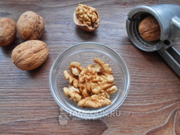 Для украшения торта подготовьте чернослив и грецкие орехи. Очистите орехи с помощью орехоколки и прокалите их на сухой сковороде несколько минут.