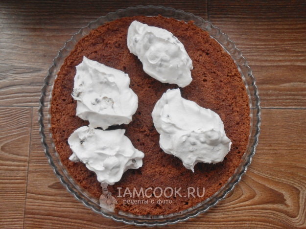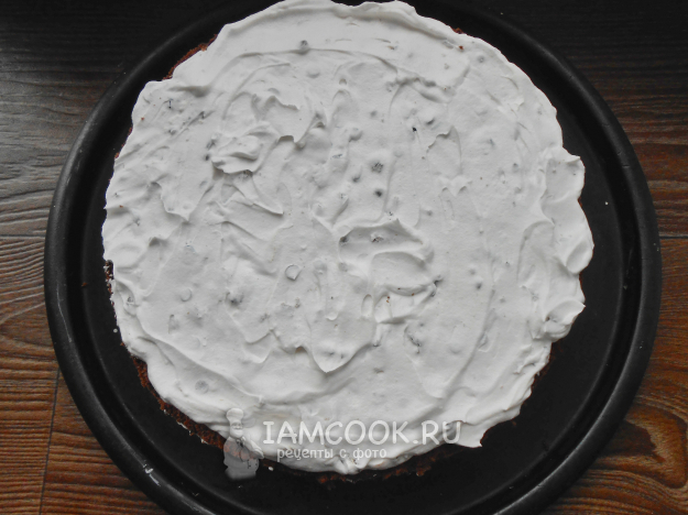 Смажьте первый корж половиной сливочного крема с шоколадом и черносливом.
