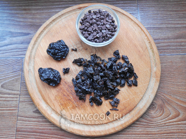 Измельчите чернослив острым ножом. Также мелко порежьте черный шоколад. Я использую шоколадные дропсы.