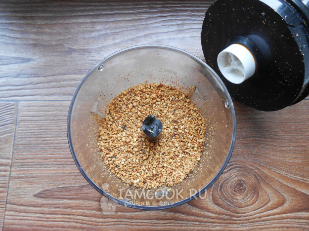 Измельчите поджаренные грецкие орехи с помощью измельчителя в мелкую крошку.