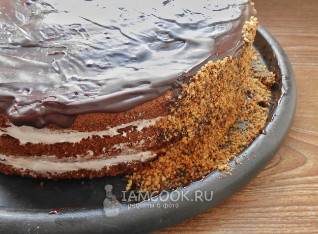 Промазывая бока торта горячей шоколадной глазурью, сразу присыпайте измельчёнными орехами. Глазурь довольно быстро застывает, поэтому бока смазывайте частями и при этом украшайте орехами.