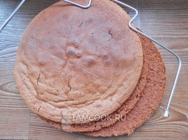 Отдохнувший бисквит очень нежный и мягкий. Разрежьте его вдоль на три равных коржа.