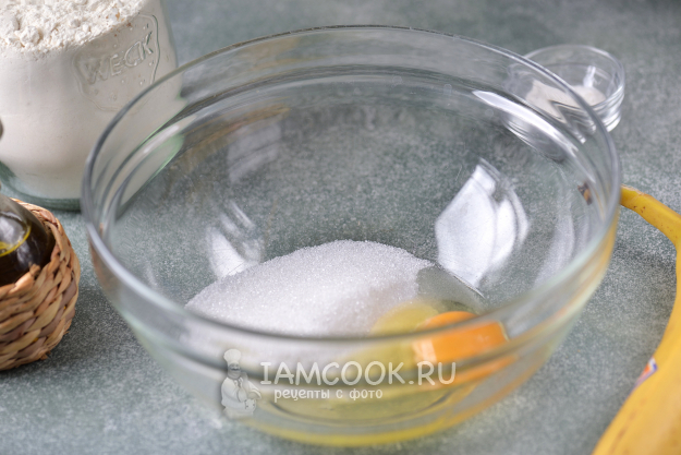 В глубокую рабочую миску вбейте крупное куриное яйцо, всыпьте сахар, взбейте венчиком до легкой пены.