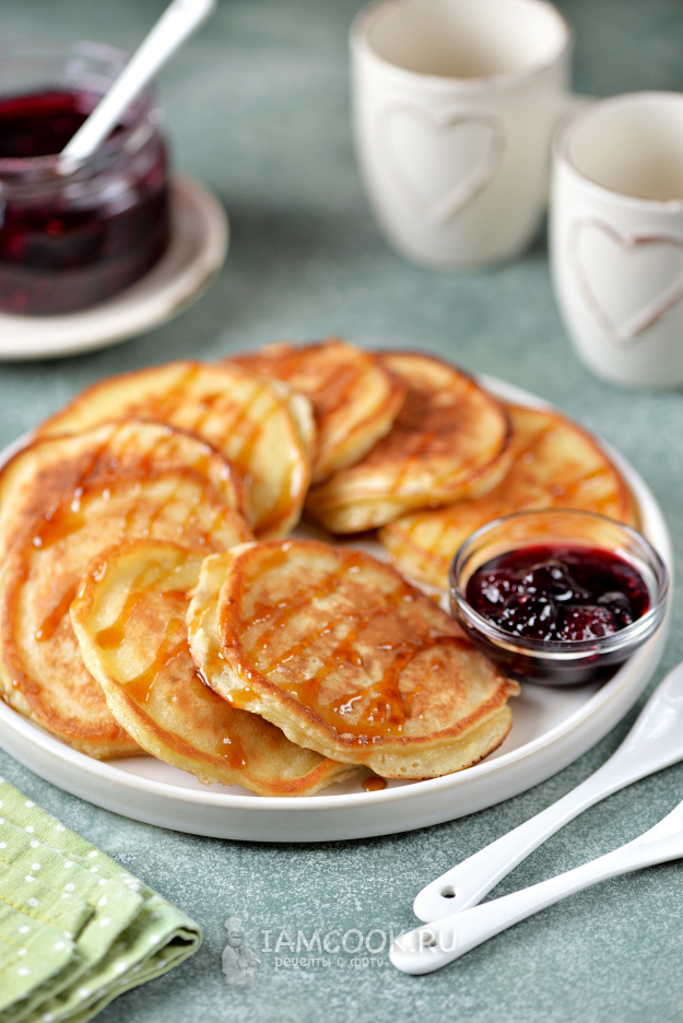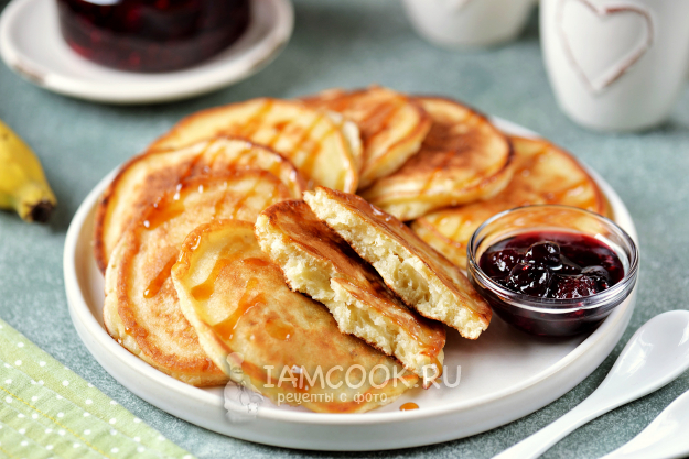 После снятия со сковороды оладушки немного опадут. На стол оладьи с бананом на сметане подавайте с сиропами или любимым вареньем, хотя они и без этого всего просто замечательные и ароматные.