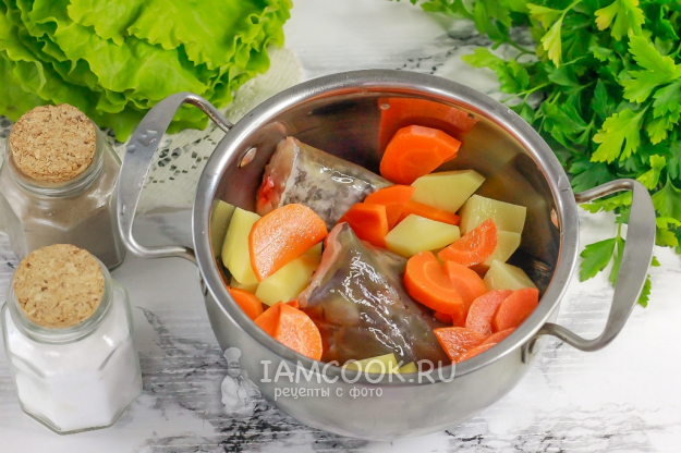 Тщательно промойте голову сома, удалите жабры, ножом счистите лишнюю слизь и снова промойте. Очистите картофель, лук, морковь и чесночные зубчики от кожуры. Выложите промытые части рыбы в кастрюлю. Нарежьте средними кубиками или ломтиками картофель и морковь, добавьте нарезки в емкость к рыбе. Всыпьте туда же лавровые листья и влейте холодную воду. Поместите емкость на плиту и включите средний нагрев. Когда вода закипит, удалите пену на ее поверхности и отварите все примерно 5-8 минут.