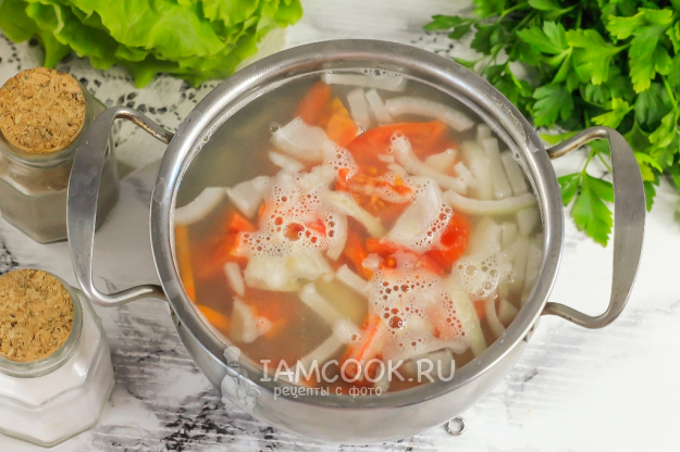 Всыпьте пшено в бульон. Промойте помидоры и нарежьте их средними кубиками, а лук - полукольцами. Добавьте обе нарезки в емкость вместе с солью и молотым черным перцем. Отварите еще 10 минут.
