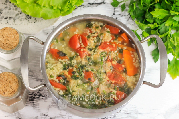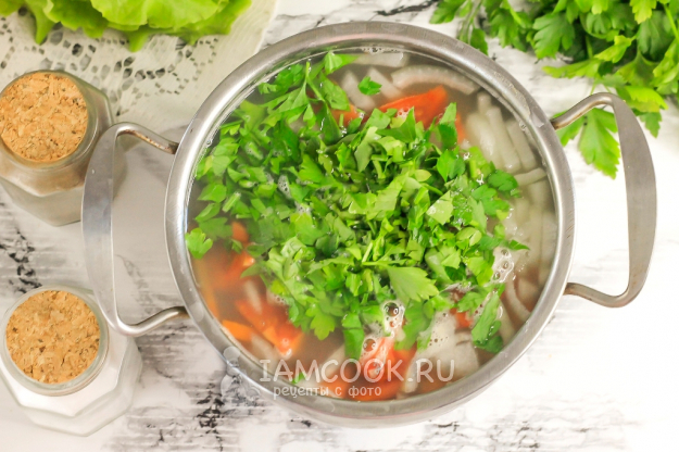 Промойте зелень петрушки и измельчите. Если у вас в наличии есть зелень сельдерея, то добавьте и ее. Всыпьте нарезку петрушки в кастрюлю и спрессуйте туда же зубчики чеснока. Отварите примерно 2-3 минуты и попробуйте блюдо на вкус. Если потребуется, то подкорректируйте.