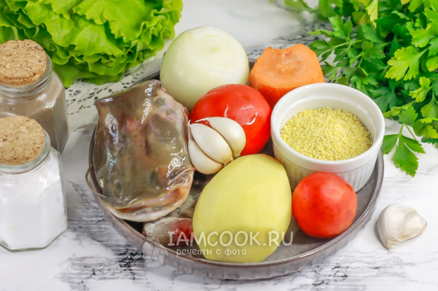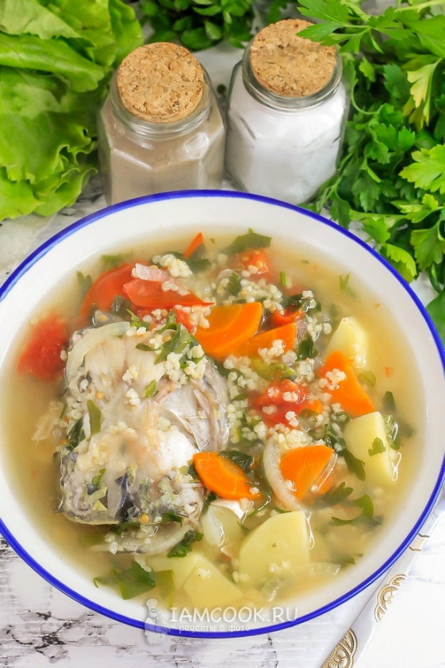 Продукты для приготовления ухи из головы сома с пшеном - перед вами.