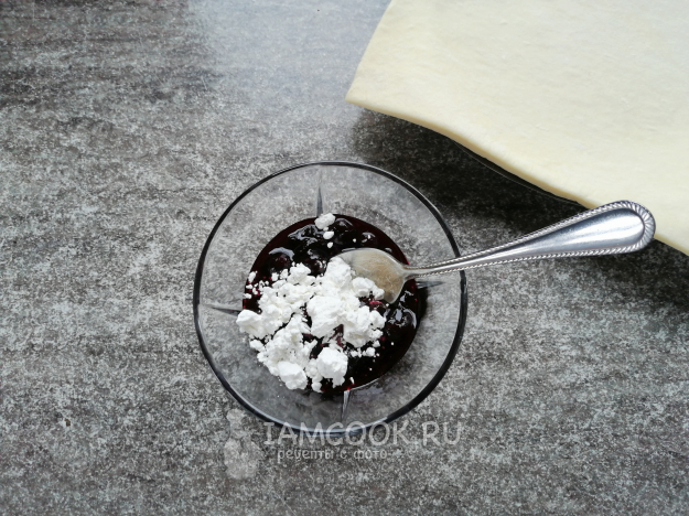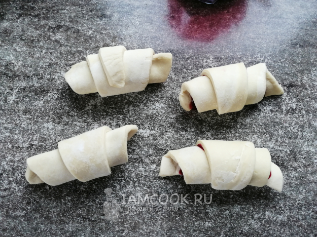 Закрутить тесто. Не страшно, что варенье немного вытекло, дальше оно не уйдёт, а в итоге получится ещё наряднее.