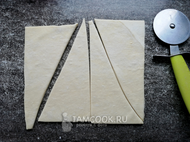 Не раскатывая тесто, разрезать его на 4 треугольника.