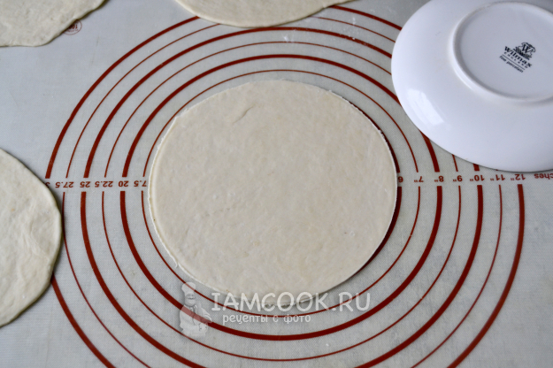 Тесто раскатайте в тонкий пласт. Толщина пласта должна быть как у теста на пельмени. Чтобы все кыстыбый были одинакового размера, вырежьте лепешки при помощи тарелки по размеру сковороды.