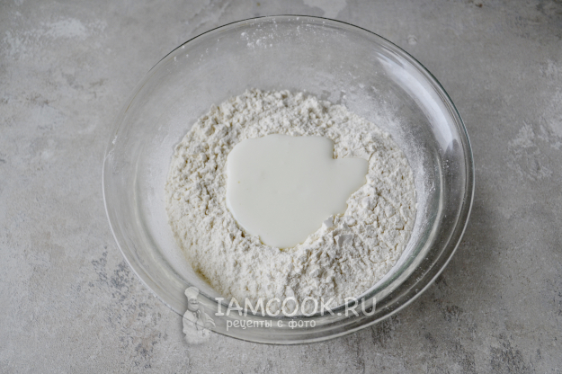 Перемешайте муку, сделайте небольшое углубление и влейте часть кефира. Сначала перемешайте ложкой муку с кефиром. Затем постепенно влейте остальной кефир.