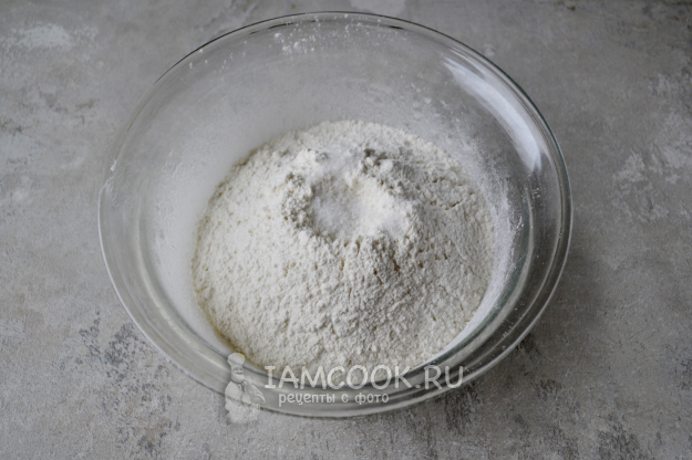 Просейте в глубокую миску пшеничную муку, добавьте соль и соду.