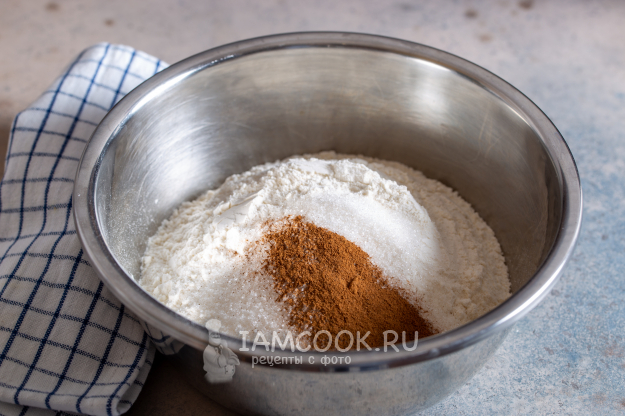 В глубокой миске смешайте просеянную муку, сахар, корицу, соду, разрыхлитель и соль.