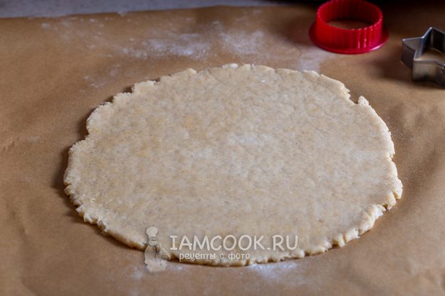 Охлаждённое тесто раскатайте в пласт толщиной не больше 5 мм. Лучше это делать сразу на бумаге для выпечки.