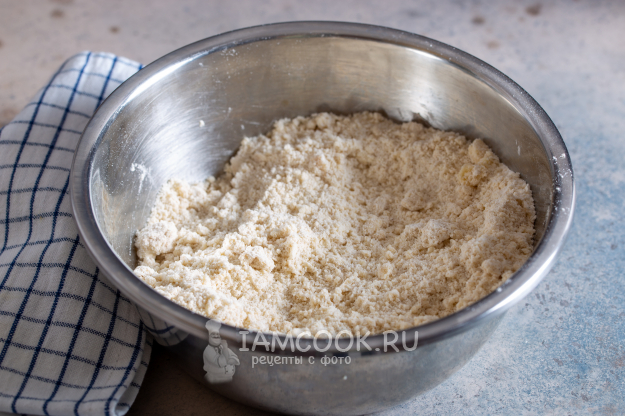 Добавьте в миску размягчённое сливочное масло и перетрите всё до крошки.