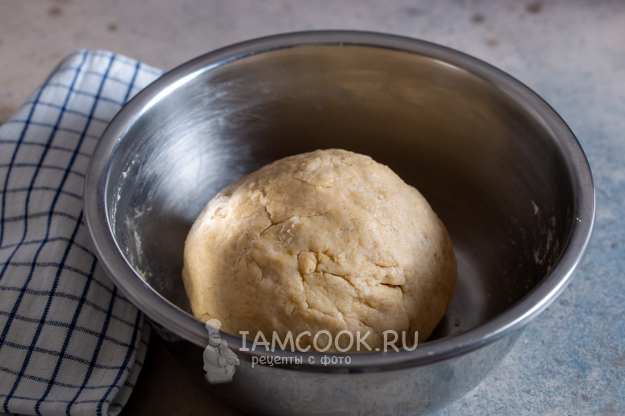 Замесите тесто и соберите в шар. Оно легко собирается и практически не липнет к рукам. Заверните тесто в пакет и уберите в холодильник минимум на час.