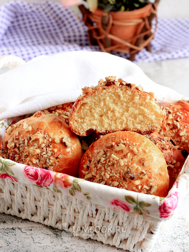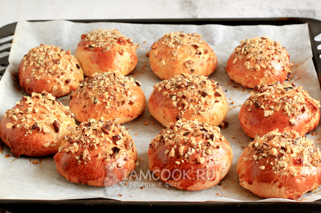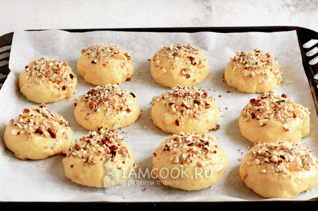 Когда булочки хорошо поднимутся, смажьте их яйцом, которое заранее оставляли, и посыпьте ореховой крошкой. Выпекайте булочки с изюмом и орехами из дрожжевого теста при 180 градусах 20 минут, но ориентируйтесь по своей духовке.