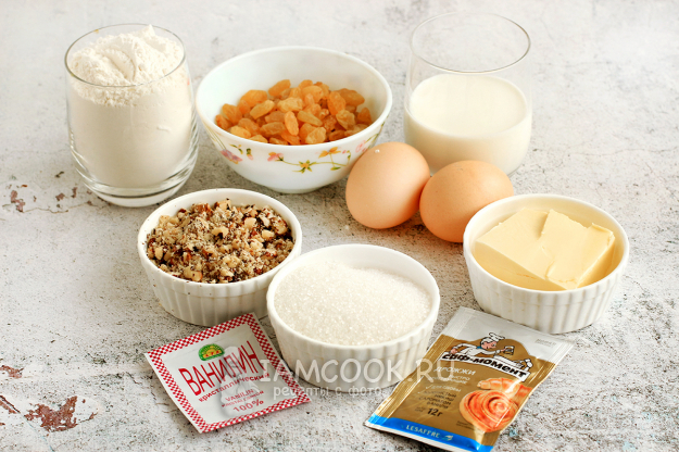 Для приготовления булочек с изюмом и орехами из дрожжевого теста нам понадобятся все вышеперечисленные продукты.
