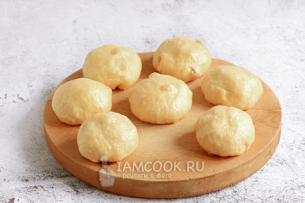 Разделите тесто на 11-12 частей, подкатайте ровные шарики. Выложите шарики на противень, выстланный антипригарным пергаментом, и оставьте для подъема на 20 минут.