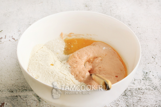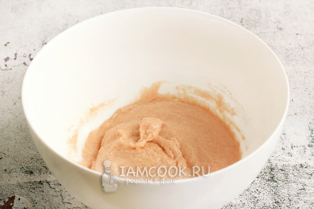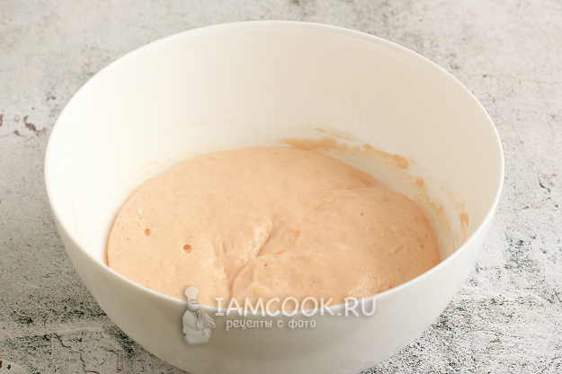Теплое молоко налейте в миску, добавьте соль и немного сахара от общего количества и всыпьте полстакана муки. Замесите опару, накройте полотенцем и оставьте в теплом месте подняться. Розовый цвет теста - из-за дрожжей, они оказались розового цвета.