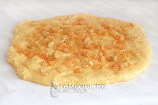 Как только тесто подошло первый раз, сделайте ему обминку. Распределите на столе и добавьте изюм.