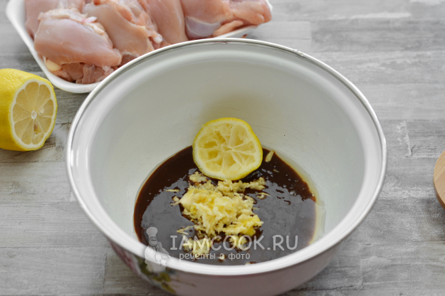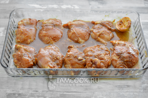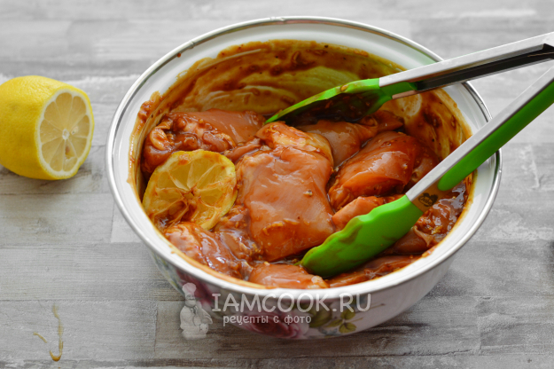 Положите в получившийся маринад курицу, перемешайте и оставьте мариноваться на 2-3 часа. Можно и дольше (на ночь).