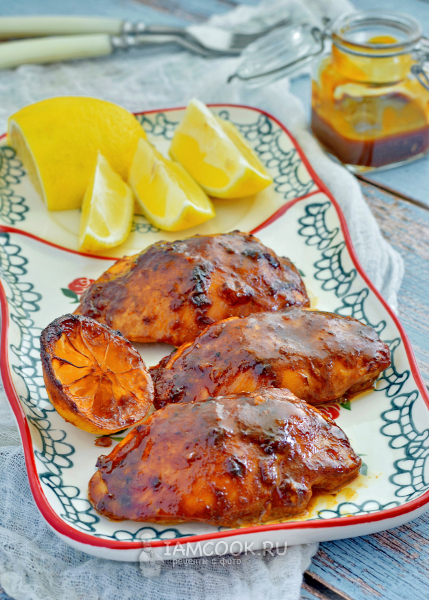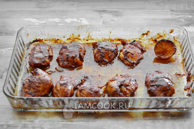 Запеченная в духовке курица в соусе барбекю готова. Дополнительно при подаче можно сбрызнуть её лимонным соком.