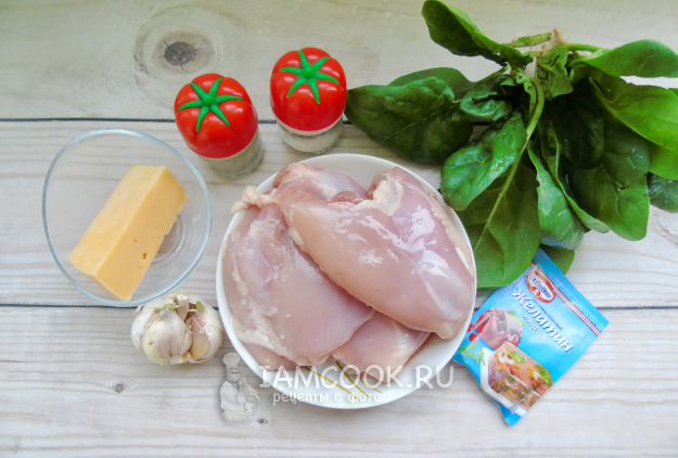 Для приготовления куриного рулета со шпинатом и сыром возьмите все ингредиенты, показанные в списке и на фотографии.