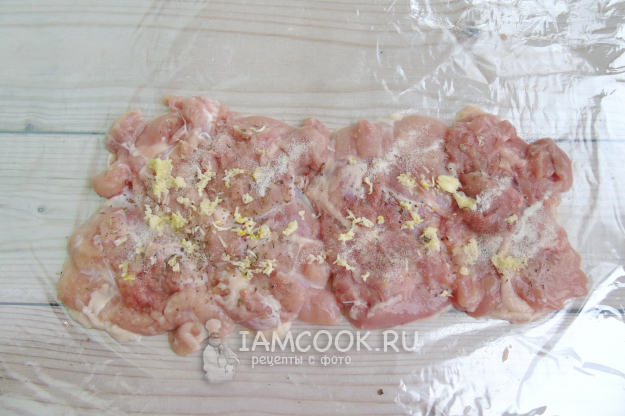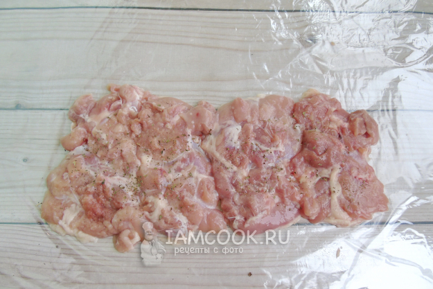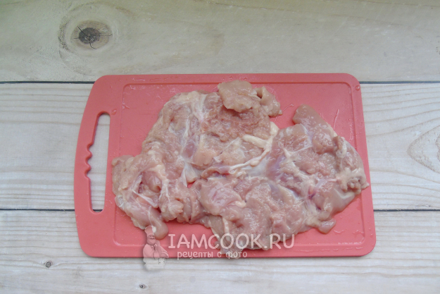Я купила куриные бедра, уже полностью обработанные, без шкурки и косточек. Филе помойте и немного отбейте с обеих сторон.
