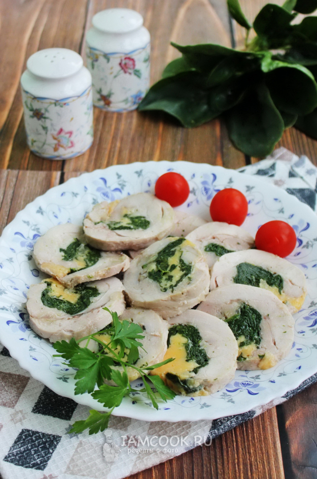 Варите куриный рулет со шпинатом и сыром на среднем огне с момента закипания 35-40 минут. Затем достаньте из кастрюли, не разворачивая хорошо охладите. После разверните, нарежьте и подавайте к столу. Вкусно как в теплом, так и в холодном виде.