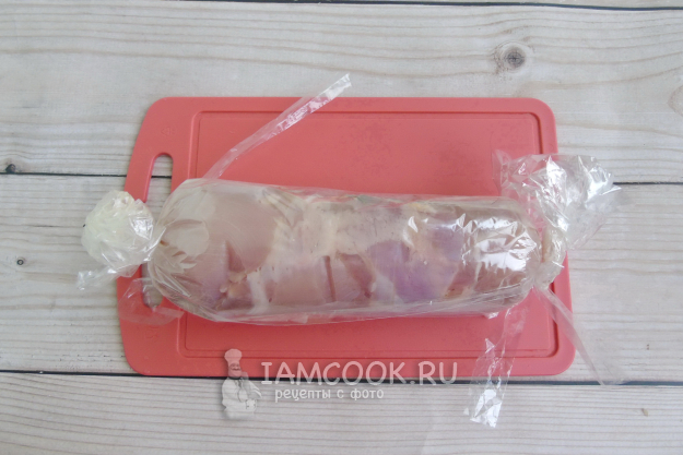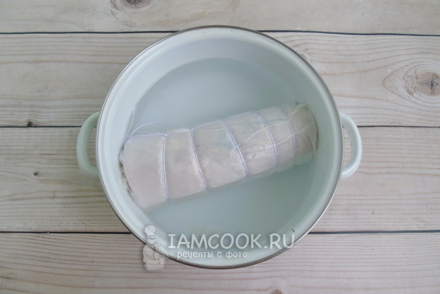 Вот в таком виде положите рулет в кастрюлю и залейте водой.