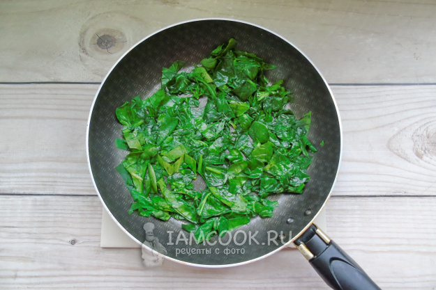 Шпинат очень тщательно помойте, в нем бывает песок и земля. Выложите в сковороду с маслом и тушите буквально 1-2 минуты перемешивая.