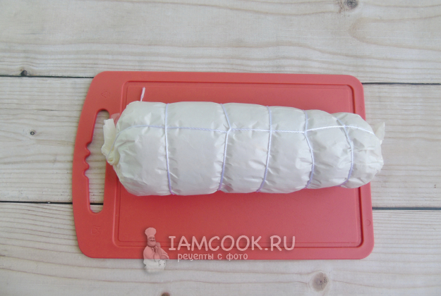 Рулет будем варить, и чтобы во время приготовления не вытек бульон, заверните еще рулет в пергамент, обвяжите толстыми нитками.
