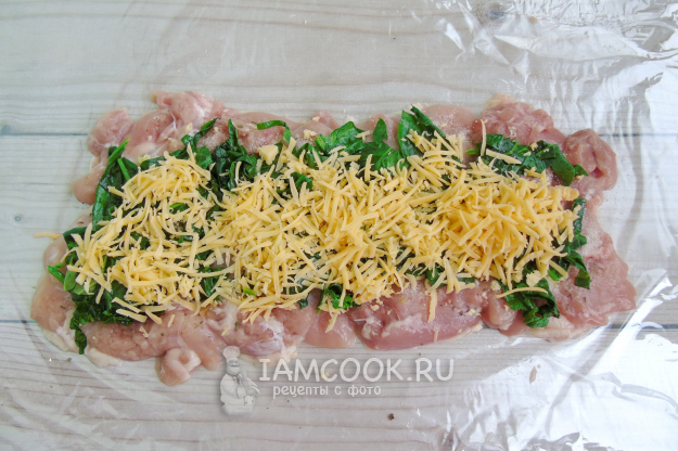 После выложите шпинат на куриные бедра. Сыр натрите на терке и разложите на шпинате.