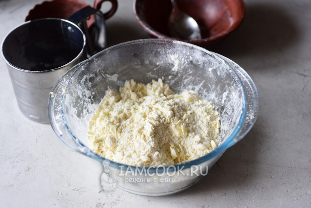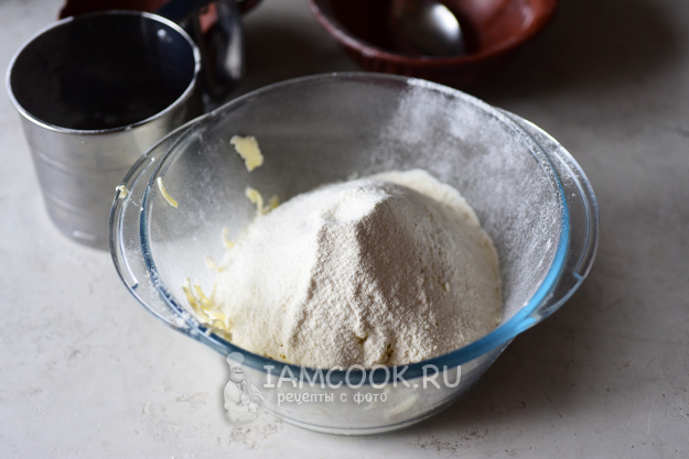 Добавим к нему 50 г сахара и просеем муку с разрыхлителем.