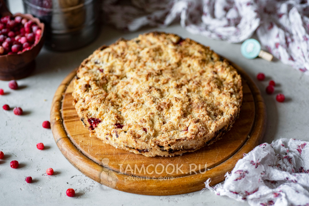 Сверху выложим оставшуюся мучную крошку. Отправим заполненную форму в уже разогретую до 180 градусов духовку. Будем выпекать насыпной пирог с брусникой 35-40 минут.