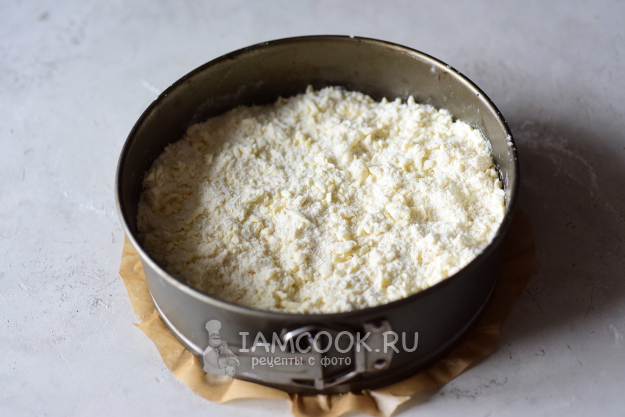На дно формы выложим пергамент для выпекания и сверху высыплем половину всей мучной крошки.