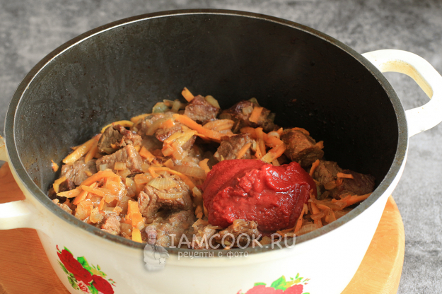 Отправьте в казан полную столовую ложку муки, и через 2 минуты помешивания - томатную пасту. Тут же посыпьте мясо чайной ложкой сахара. Обжаривайте содержимое казана пару минут. Следите, чтобы ничего не пригорело.