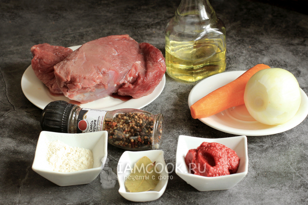 Чтобы приготовить классический гуляш из говядины с подливкой, соберите необходимые продукты по списку ингредиентов. Лучше всего брать лопаточную часть говядины без жира и пленок, так как время приготовления напрямую зависит от сорта мяса.
