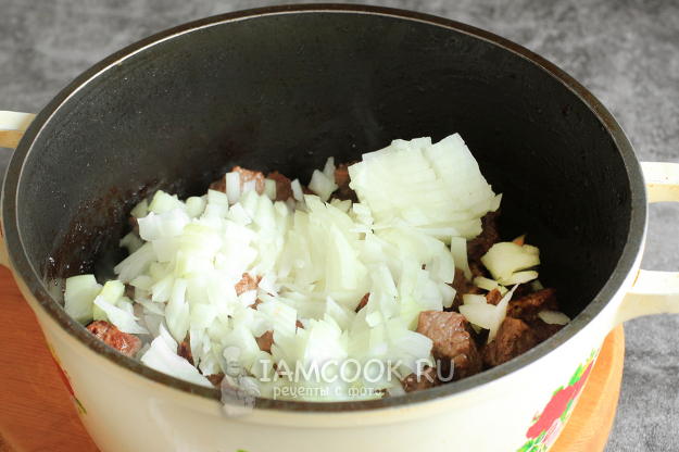 К мясу добавьте измельченный репчатый лук. Обжаривайте пару минут. Предварительно посолите мясо, потом еще будете доводить до вкуса.