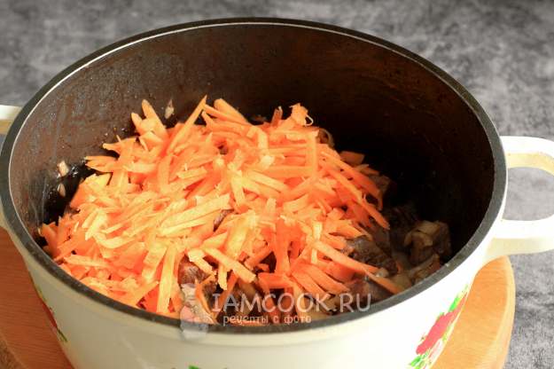 Добавьте натертую на терке морковь. Обжаривайте еще минуты три, пока морковь не "уляжется".