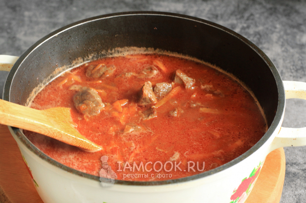 Тушите мясо под крышкой на малом огне от часа до двух, время будет зависеть от качества мяса. Периодически проверяйте количество жидкости и мягкость говядины.