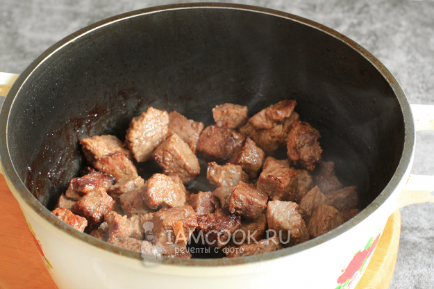 В казане или сковороде хорошо нагрейте растительное масло и обжарьте кусочки мяса до румяного цвета. Огонь при этом выше среднего.
