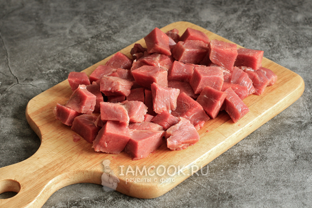 Мякоть говядины нарежьте небольшими кусочками одинакового размера.