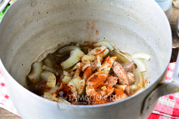 Всыпьте сладкую молотую паприку и размешайте, обжаривайте пару минут, чтобы специя раскрыла свой аромат. Добавьте соль и чёрный молотый перец по вкусу.