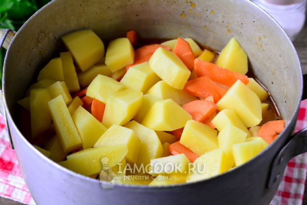 Все необходимые овощи почистите. Когда говядина станет мягкой, выложите к ней нарезанный ломтиками картофель и морковь. Тушите гуляш из говядины с картофелем еще 15-20 минут.