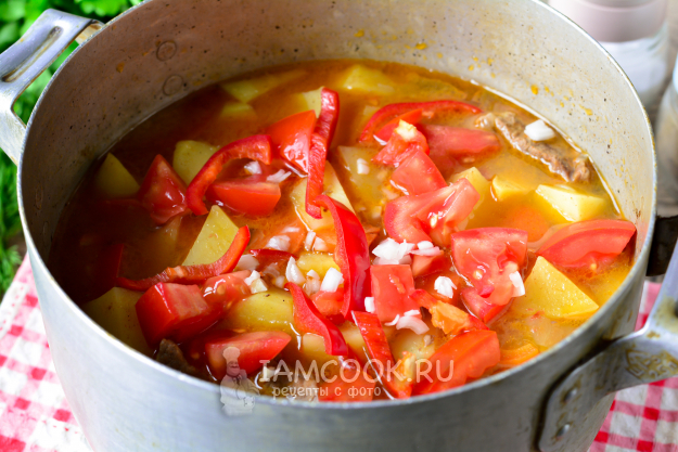 Когда картошка будет мягкой, всыпьте оставшиеся овощи - нарезанный полосками сладкий красный перец, дольки помидоров и мелко нарезанный чеснок для аромата.