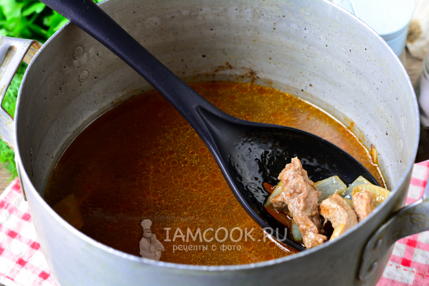 Влейте в кастрюлю горячую воду и тушите говядину 40-50 минут, до мягкости, на медленном огне.