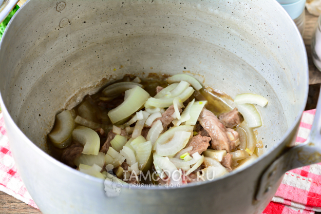 Разогрейте растительное масло в сковороде, выложите мясо и обжаривайте 7-8 минут. Затем добавьте лук и жарьте все вместе еще 2 минуты.